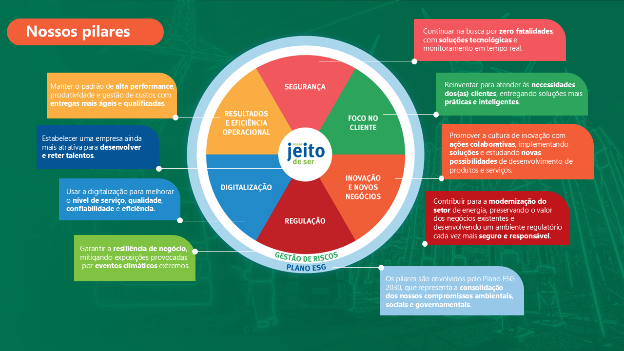 Somos referência no setor de utilities, com ações listadas no segmento de mercado que possui o mais alto nível de Governança Corporativa - o Novo Mercado da B3. Contamos com a combinação de um management experiente com a expertise da maior empresa de utilities do mundo, a State Grid Corporation of China. Temos forte compromisso com a Sustentabilidade, garantindo a resiliência do negócio frente às Mudanças Climáticas, buscando impulsionar a transição para uma forma mais sustentável e inteligente de produzir e consumir energia, maximizando nossos impactos positivos na comunidade e na cadeia de valor.