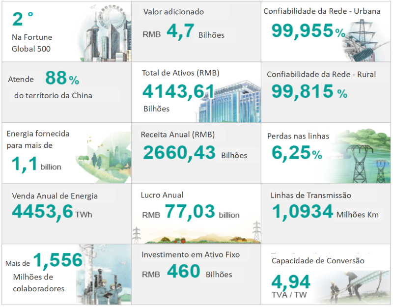 Como a maior empresa de utility do mundo, a State Grid ficou em 2º lugar no Ranking da Fortune Global 500 com sua missão de fornecer energia mais segura, limpa, econômica e sustentável. Ao longo de mais de 20 anos, a State Grid registrou as mais longas horas de operação segura do mundo de sua rede super large, completou mais de 20 projetos de transmissão de energia UHV e integrou a maior quantidade de energias renováveis com a maior capacidade de transmissão de energia. Entre as empresas estatais centrais, ficou em primeiro lugar em termos de propriedade de patentes por anos. Também teve o mesmo rating soberado da China's pelas três principais agências de classificação de crédito por 9 anos consecutivos (Standard & Poor's A+, Moody's A1, and Fitch A+). Como uma empresa inovadora líder da indústria, tem sido a No.1 das 500 Marcas Mais Valiosas da China por 6 anos e de Utilities 50 por 4 anos consecutivos.