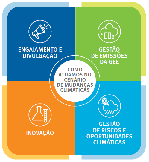 Para fazer frente às mudanças climáticas, avaliamos e implementamos diferentes ações para a adaptação dos negócios e a mitigação de impactos relacionados às nossas atividades, em especial a emissão de gases de efeito estufa. Nossas iniciativas são centralizadas em quatro frentes de atuação, desdobradas em ações e orientações para a execução dos projetos