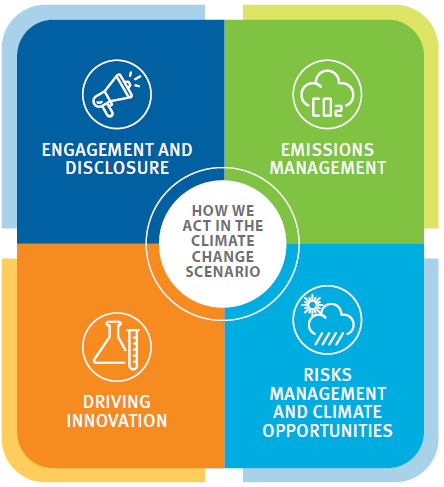 To face climate change, we assess and implement different actions to adapt our businesses and mitigate impacts related to our activities, especially the emission of greenhouse gases. Our initiatives are centered on four fronts of action, broken down into actions and guidelines for project execution.
